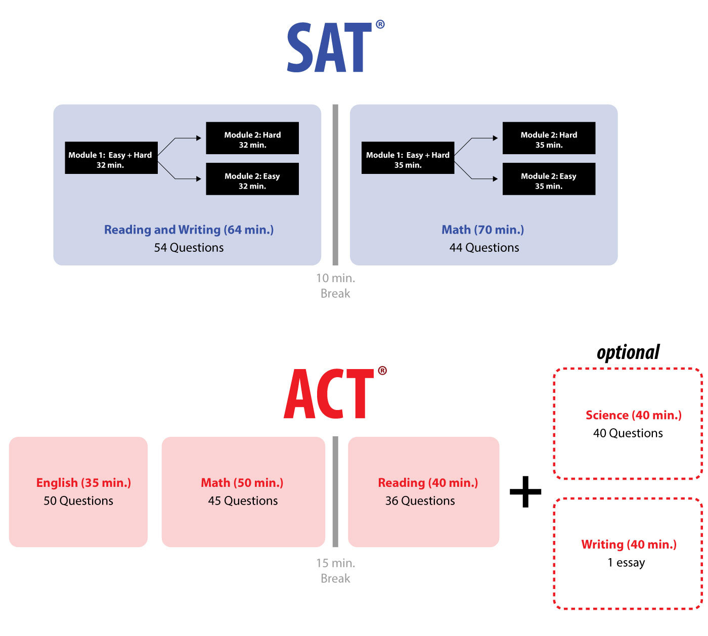 With a shorter test and the removal of a mandatory science section, the test has become similar to SAT Structure. However, there are still key differences that may impact a student’s choice to take one exam over the other.